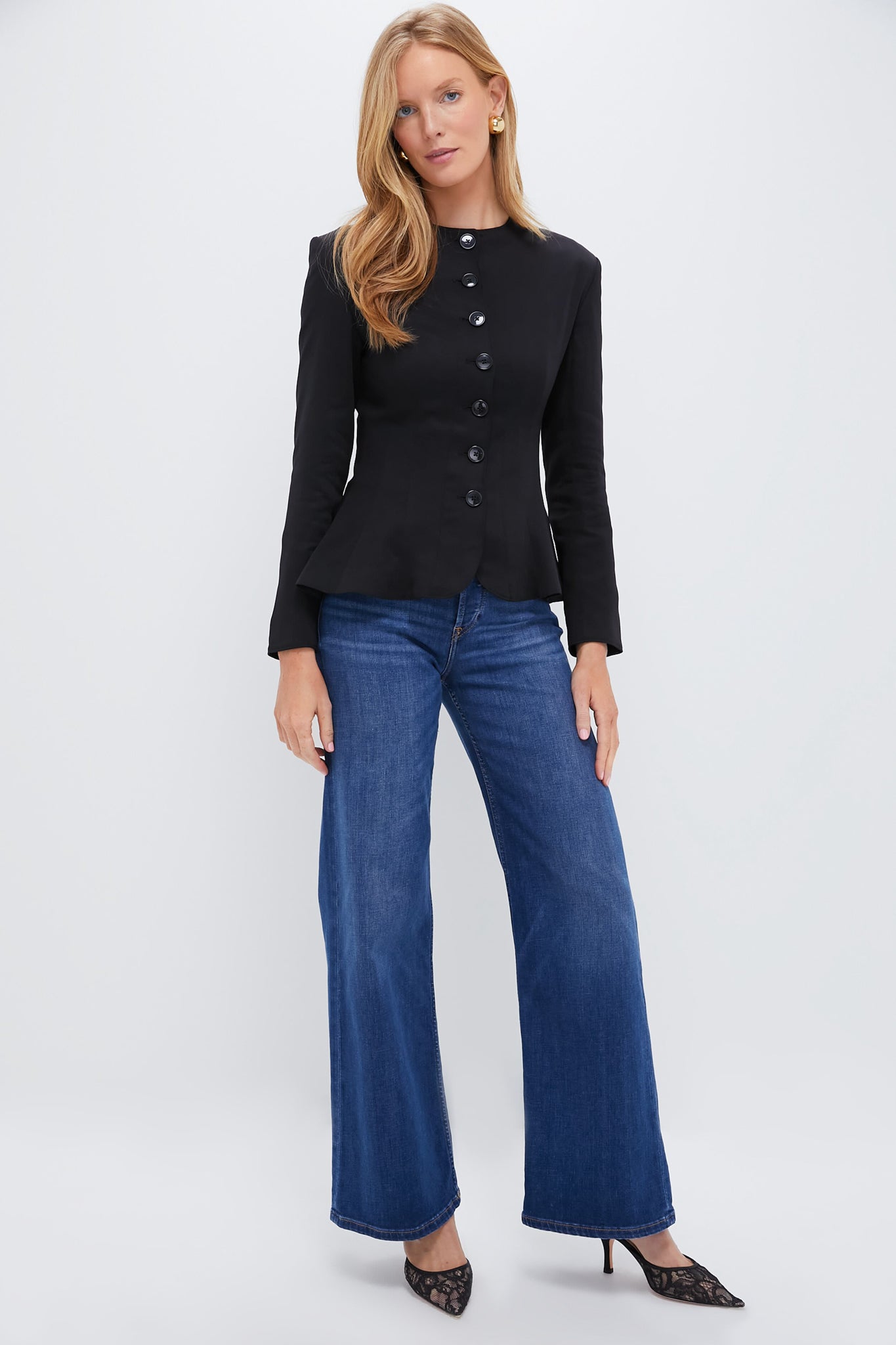 Crafted from a luxe smooth fabric. this Black Iris Jacket features standout shoulders and a peplum hem providing a clean and sophisticated look. We are styling this with loafers and denim for an office look. or with skirt and heels for a date night ensemble.