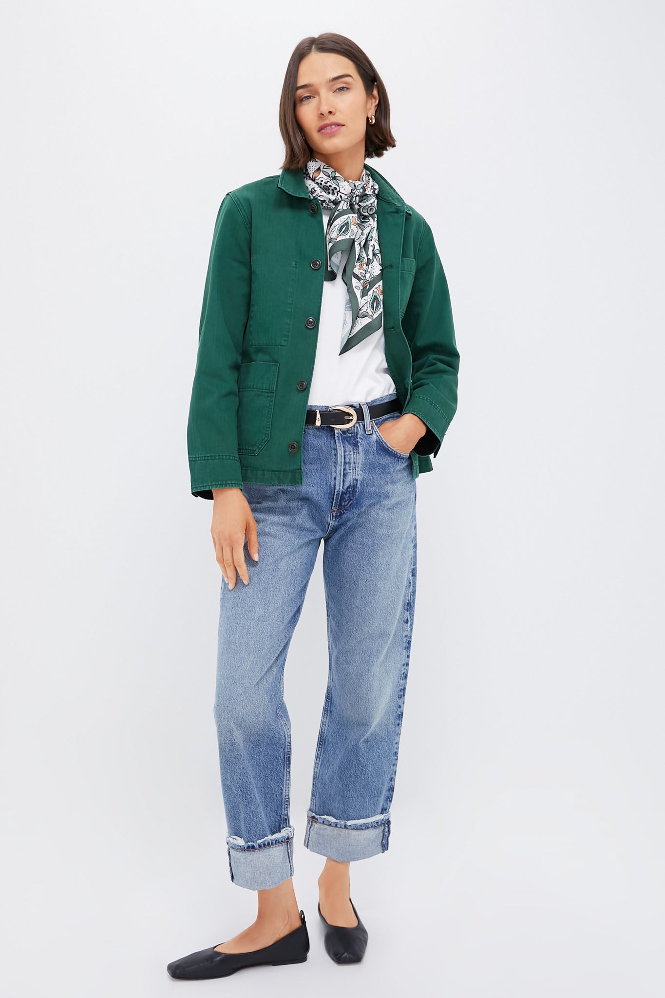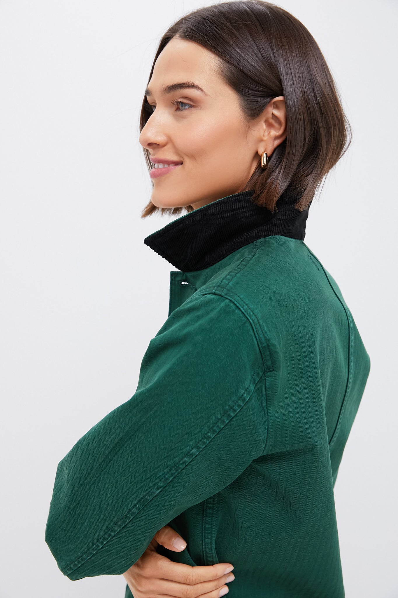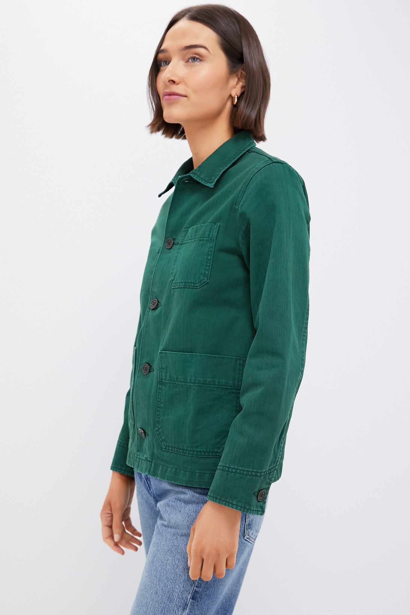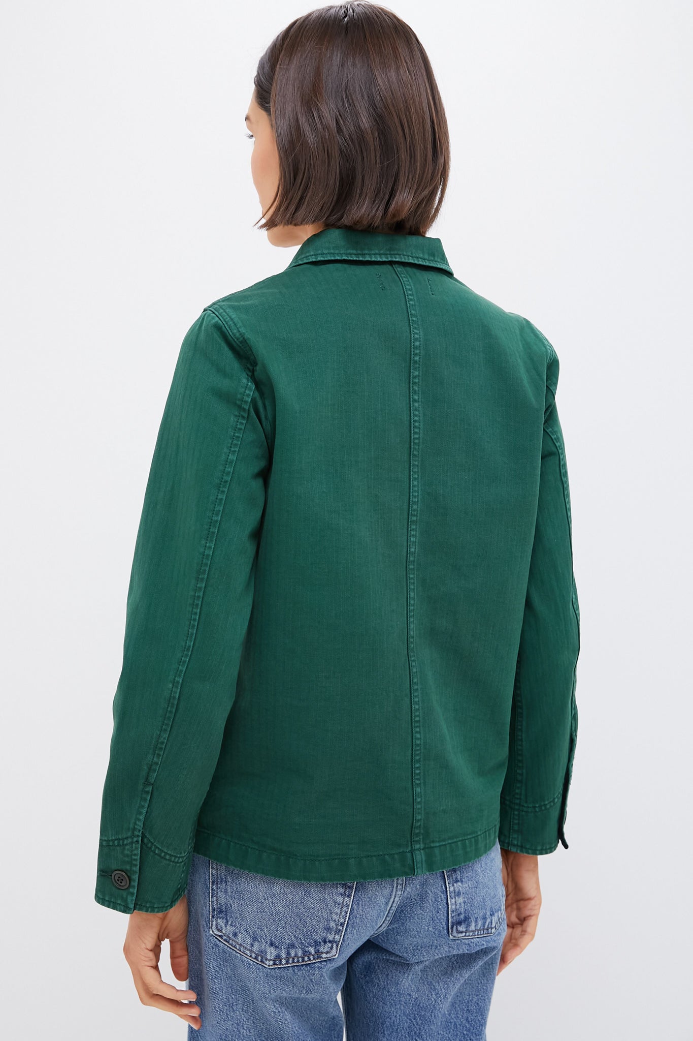 Boasting a rich beautiful hue. the Emerald Britt Work Jacket is that easy third layer that pulls everything together. Classically chic with utilitarian front patch pockets. pair it with jeans and a t-shirt for a classic look. or throw it over a dress for a trendy and effortless ensemble.