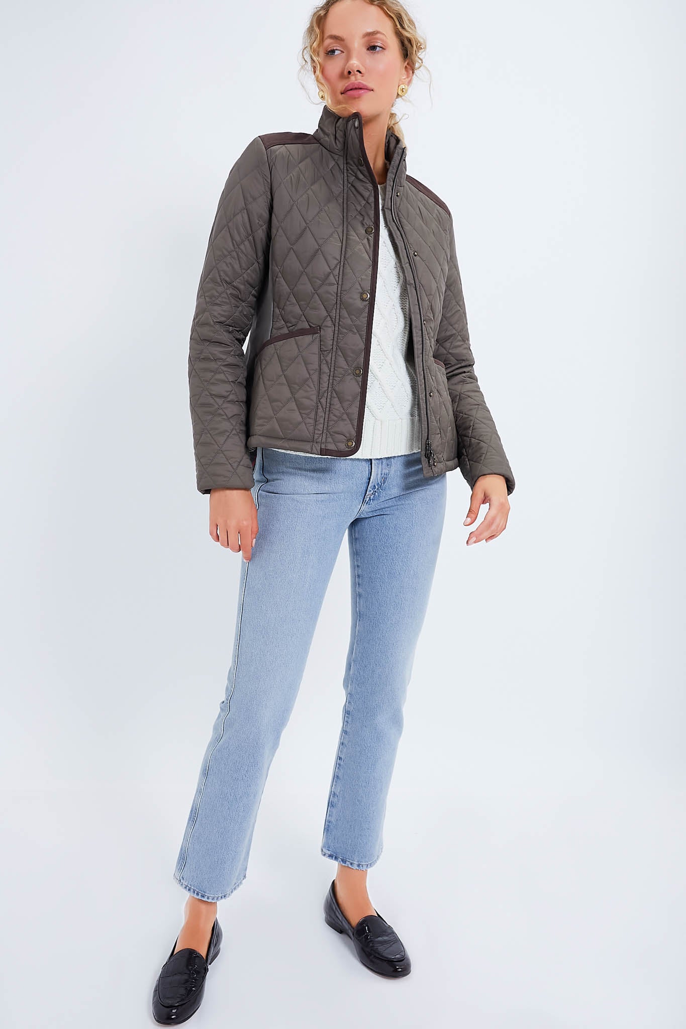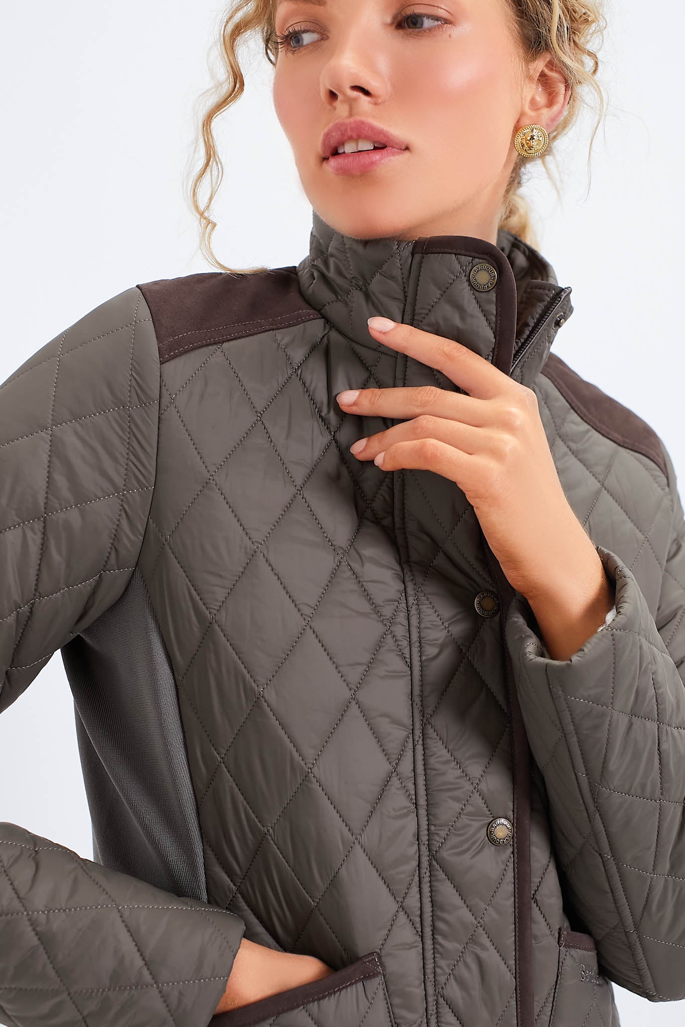Absolutely essential and super effortless. we love the timelessness of the Winter Moss Highfield Quilted Jacket. With luxurious suedette accents on the shoulders and pockets. adding an extra touch of sophistication and texture. this comfy jacket features stretch side panels. ensuring a flexible and flattering fit that moves with you throughout your day. Style it with denim and loafers to visit an art gallery or grab a latte. and try it with a cozy turtleneck and sneakers for weekend getaways and orchard trips.